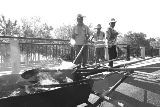 因为沥青温度过高,每隔10多分钟侯自喜们就要将铁锹进行火烤,以免沥青黏在铁锹上影响正常使用。“站在沥青上时间长了烫脚,一个月怎么也得穿破两双鞋。”侯自喜说。
