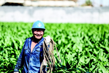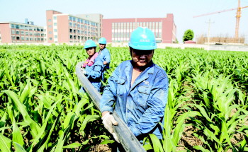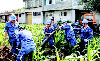10日下午3点,明晃晃的烈日炙烤着大地,在南张中学西侧的玉米地里,电力配网工程队的7名施工人员正在紧锣密鼓地进行电源进线作业。高温加上高强度的工作,他们的衣衫早已浸湿,但工作进度耽误不得。
