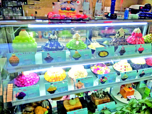 世茂广场一家甜品店内,搭配了芒果、西瓜、沙冰的甜品种类丰富。