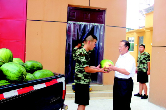 7月31日,第90个“八一”建军节来临之际,农行山东省平原县支行党委委派纪委书记陈静一行冒着酷暑来到该县消防大队,与一线官兵共叙鱼水之情,为他们送上了2000多斤本地特产西瓜,表达了农行人对子弟兵的节日问候和真诚祝福。