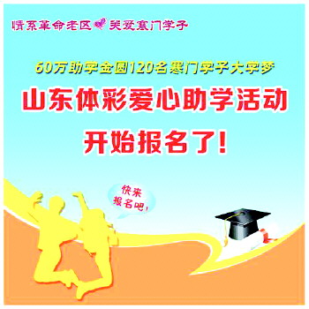 情暖寒门学子,爱心助梦飞翔!为了帮助更多品学兼优、家庭贫困的高考生圆梦大学,山东体彩连续第十年开展“情系革命老区 关爱寒门学子”爱心助学活动,今年的活动由山东省体育彩票管理中心、山东省希望工程办公室、山东电视台生活频道《生活帮》、大众网联合举办,将为全省120名贫困大学新生每人提供5000元助学金,总共60万元助学金倾情帮助优秀寒门学子圆梦大学!