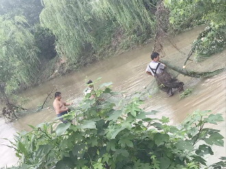 在市中区东沙河沿岸,不少市民穿着雨靴,拿着网子在河里甚至玉米地里捕鱼。