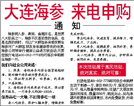 大连海参 来电申购   打进电话400-052-7778即可低价申购野生淡干刺参一斤,原价3960元/斤,现低价690元/斤,每人限量申购两份。还望广大朋友抓紧时间报名,限量2000斤,购完为止。如与承诺不符愿承担法律责任,市内免费送货,外地免费邮寄。   海参同人参、燕窝、鱼翅齐名,是世界八大珍品之一。海参不仅是珍贵的食品,也是名贵的药材。为让广大顾客亲身感受野生海参对广大顾客朋友身体健康带来的效果海参公司特举行健康公益进万家活动只要您拨打电话400-052-7778均可低价申购野生海参一斤。      我们向社会公开承诺:   1、保真:每根海参均符合国家检验标准。绝非糖干海参破坏营养成分。   2、保证野生刺参,非养殖,肉厚刺多,口感软糯。   3、每根海参均采用淡干技术,保证营养不流失,一斤海参大约(80-100)头。      保养品吃一大堆,不如海参吃一根   老人吃海参,保护心脑血管,增强身体免疫功能。   学生吃海参,促进发育,提高智力,增强免疫力,少生病。   男人吃海参,缓解疲劳,滋阴补肾,养肝强身健体,提高生活质量。   女人吃海参,调节内分泌,护肝保血管,滋阴补血,美容养颜。 本次活动属于惠民活动, 绝对真实,绝对可靠! 通 知