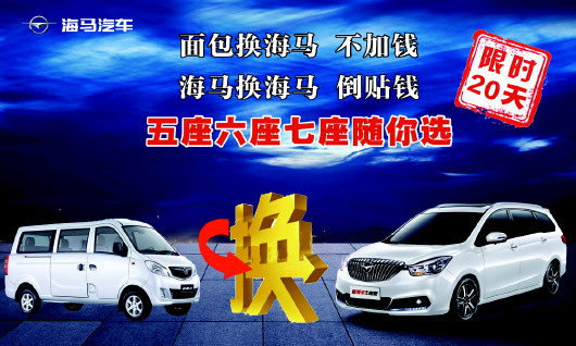 海马汽车八月钜惠,冰爽价格“夏”降到底!面包车置换海马不贴钱!海马换海马倒贴钱!五六七座任你选!更有分期两年免息优惠,极速贷款,万元钜惠、极速提车任你选!这一夏享特价!