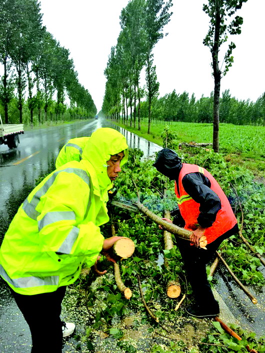 公路站工作人员冒雨清理道路树木。
