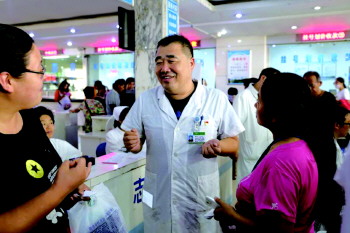 义诊台被患儿及家长围得水泄不通,市立医院儿科二病区主任于文立、副主任常久利和医护人员耐心回答患儿家属的问题。当日上午500余名患儿及家长来诊,两位主任忙碌地为孩子们检查,嗓音沙哑,衣服也浸湿了一大片。
