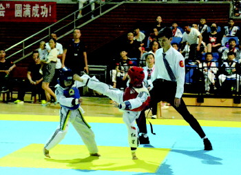 16日,菏泽市全民健身运动会暨菏泽市大众跆拳道精英赛在菏泽演武楼举行,比赛为期2天,共有来自各县区的26支队伍近千人参加。据悉,参赛选手进行了个人竞技比赛、个人品势赛和团体品势赛三项赛事的比拼,赛中小选手们一招一式“专业范”十足,赢得赛场观众阵阵掌声。