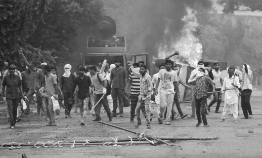 25日,在印度哈里亚纳邦潘切库拉,骚乱人群向安全人员投掷石块。 新华/法新