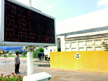 新增全自动扬尘检测系统、厂区内增设全自动喷淋洗车台……济宁中天新型材料有限公司投资环境保护治理,转型升级加快,获得长远效益。图为企业门口的检测器可自动检测每日环保相关数据。