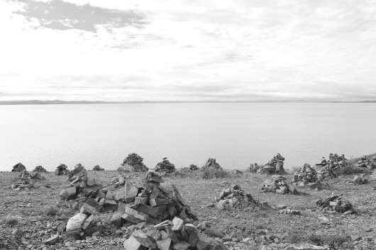 当地居民视鄂陵湖为圣湖,湖岸边摆满了玛尼石堆。