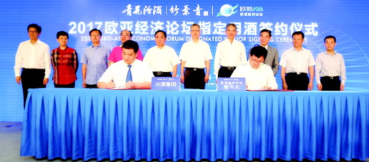 9月1日,汾酒集团与欧亚经济论坛组委会的签约仪式在北京举行。在即将开始的第七届欧亚经济论坛上,“青花汾酒”和“竹叶青酒”将正式成为本届论坛的官方指定用酒。