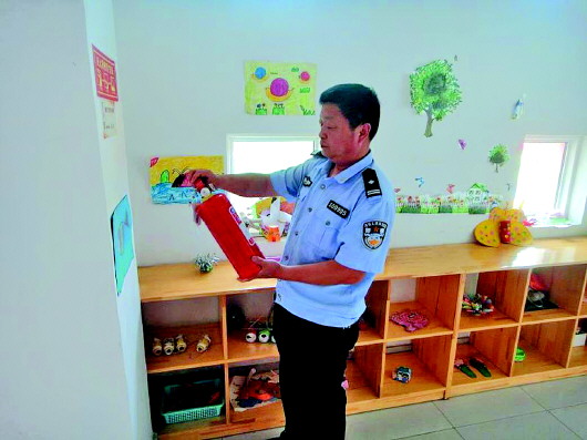 社区民警检查幼儿园消防设施。