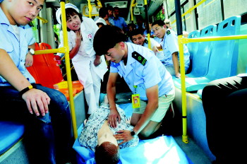 公交驾驶员现场模拟心肺复苏。 本报记者 李洋 摄
