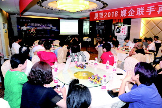 朱曙东会长以热播影视剧《人民的名义》、《战狼2》开篇,从国内房地产市场及政策分析、三四线房地产市场走势分析、新时期房地产企业应对策略等三大方面入手,对2017年房地产市场作了小结,对2018年楼市走向做了预判,特别是新时期房地产企业应对策略,从产品转型、业态转型、资源配置转型、营销模式转型等角度,为房产营销提供了独到的发展思路,赢得了现场嘉宾的阵阵掌声。
