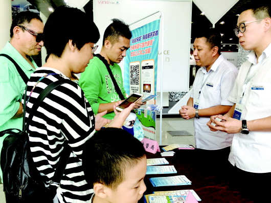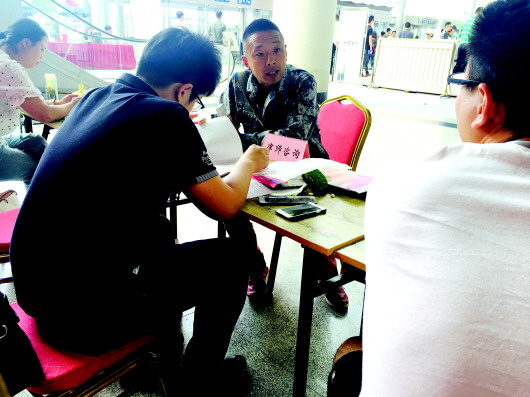 房管局工作人员正为卢女士一家解答购房疑问。目前已经被限购的卢女士虽仍旧有投资需求,但对目前投资置业所牵涉的一系列政策仍旧疑惑不少,听说房展会现场有房管局工作人员现场办公,一家人特地前来看展咨询。