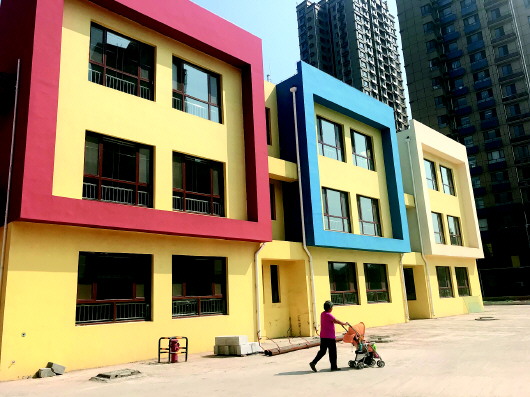 21日,在映月紫云城小区西边,记者找到这座幼儿园。该幼儿园为一座三层楼,楼体已完工,外部黄色墙体夹配红蓝两色,门窗均已安装完毕;其内部教室的装修,也已初具规模。