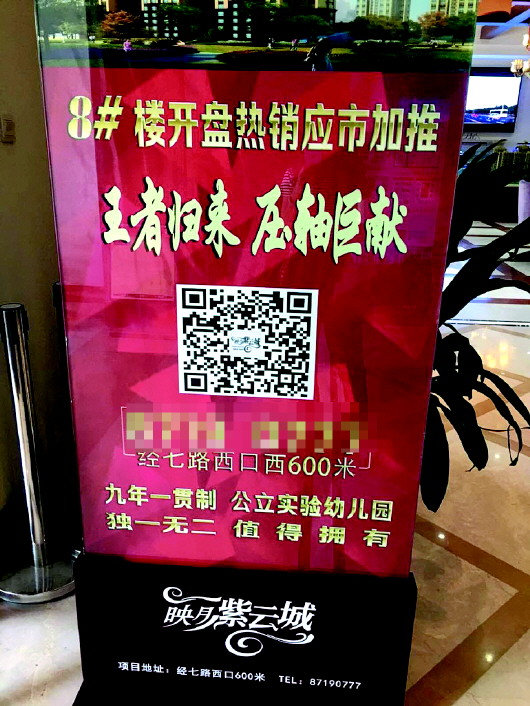 时隔两年,郭女士仍对购房之初,开发商关于小区公办学校的各种宣传广告印象深刻。21日,记者来到机床二厂路西端的映月紫云城小区,郭女士出示了当时购房时所拍下的宣传广告照片,“‘九年一贯制、公立实验幼儿园’‘映月紫云城,入公立幼儿园,读济微名校,300米解决孩子12年教育问题’。”郭女士表示,开发商售房时,一直都打着此类广告进行售卖。