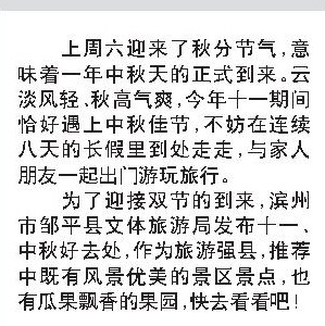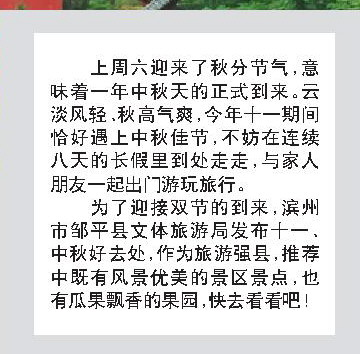 为了迎接双节的到来,滨州市邹平县文体旅游局发布十一、中秋好去处,作为旅游强县,推荐中既有风景优美的景区景点,也有瓜果飘香的果园,快去看看吧!