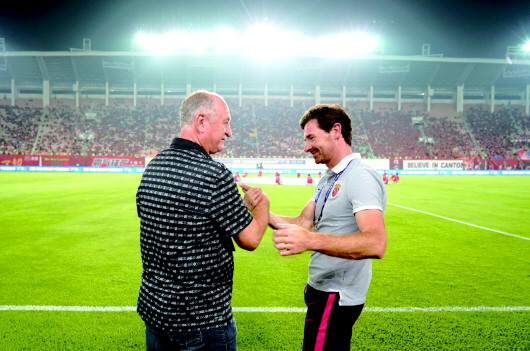本赛季恒大主帅斯科拉里(左)和上港主帅博阿斯两位名帅多次斗法,这一次笑到最后的又是博阿斯。 新华社发
