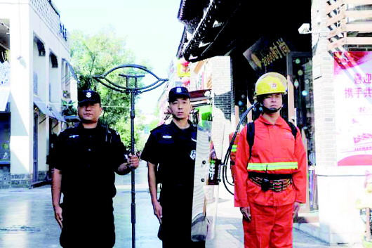 记者在宽厚里看到,济南公安在群众聚集的重点区域,均设置了3人组成的单兵小组,由特勤队员、消防保安、治安保安组成,携带必要的器材,在人群密集区域值守,及时处置突发险情。