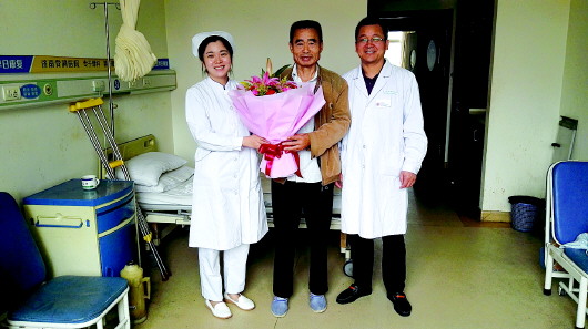 正跟病友们聊着天,济南骨科医院院长郭延章,主刀医生杨学良主任等医务人员抱着大束鲜花走了进来,“祝贺你战胜病魔,恭喜你重获健康”,郭延章将花送到王成森怀里,跟他握手拥抱。“这一刻太让人高兴了。”“出了院还要记得定期复查,注意保养啊。”杨学良主任作为主刀医生再次给王成森进行了检查,并一再叮嘱。