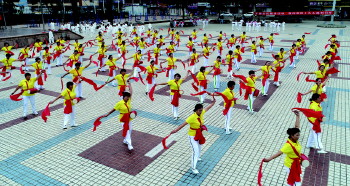 9月26日,石岛管理区在石岛广场举行了庆国庆,迎重阳,腰鼓、柔力球、太极拳展演,来自各社区和乡村等全民健身广场舞代表队近千名群众参加广场舞表演,以喜悦的心情迎接十一国庆节和党的十九大召开。