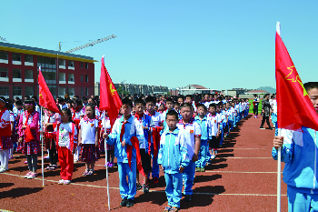 国庆节前夕,沂源县振兴路小学举行了“向国旗敬礼,喜迎国庆节”为主题的升旗仪式。培养学生的爱国热情。 (黄晓艳)