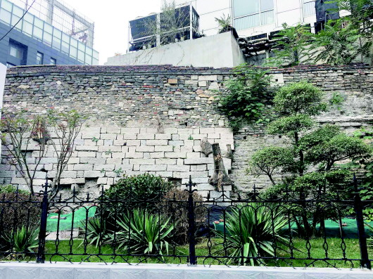 这段高约6米、长约15米的古城墙很有历史沧桑感,经过岁月变迁,它的厚度仅剩几十厘米,由青石块和不同古砖砌成的墙面也是凹凸不平,多种颜色混杂。城墙底部由高约1.2米的条状青石砌成,上面高约3米的墙体由大青砖砌筑,并用白灰勾缝,其中还夹杂着一些红砖,砖的大小、厚薄也不一样,零星有些修补的痕迹,墙体上还有不少粗大的树根从砖缝里长出,上面的枝干已被锯掉。在老城墙的北段,还有一个青砖砌筑的城垛。记者现场看到,用栏杆围着的这段城墙已经进行了绿化,栏杆里的植被长势良好,在古老城墙下显得勃勃生机。