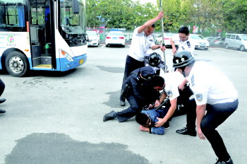 本报菏泽10月15日讯(记者 张建丽) “一名男子携带不明液体乘坐公交车,该男子拒绝接受三品检查,挟持人质威胁驾驶员,情况危急……”13日,菏泽公交联合南城派出所开展了一场反恐、防暴演练,来进一步增强驾驶员和保卫人员安全防范意识,提高应对恐怖暴力事件的应急处理能力。