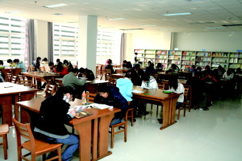 学生们在三楼期刊阅览室阅读刊物。