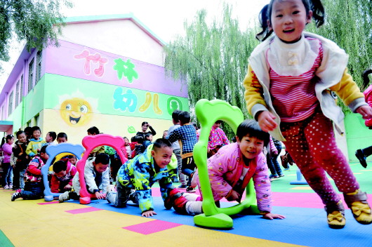搬到竹林新村后,小朋友们在平坦的操场做游戏。