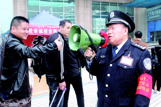 ◥陈金良在聊城汽车站义务宣传环保时,旅客向他伸拇指致敬。