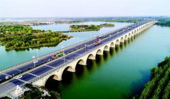 而在济宁兖州区,2014年建成通车的泗河九州大桥西接九州路、东接曲阜高铁连接线,是济宁市确定的通京沪高铁曲阜站重点工程。大桥全长1103米,主桥长668米,桥面全宽31.9米,双向六车道,并分设两侧人行通道,大桥主桥采用预制架设小箱梁。