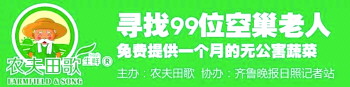 农夫田歌联合齐鲁晚报日照记者站发起“寻找99位空巢老人”公益活动,将在日照全城寻找99位空巢老人,免费提供一个月的无公害蔬菜。希望尽我们的努力,让老人在这个节日得到更多的关爱!让我们一起,共同关注“空巢老人”!