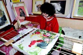 经过一个月的酝酿,10天的精心制作,日前,威海市非物质文化遗产传承人王培兰(右)为迎接十九大创作的剪纸作品《喜迎十九大、争创新业绩》创作完成。这幅作品由党徽、天安门、牡丹、蝙蝠、万年青等元素构成。