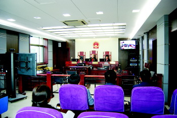 10月20日,聊城市中级人民法院首次启用远程视频法庭开庭审理减刑假释案件,标志着聊城中院远程视频法庭建成启用并取得成功。据悉,这是聊城市法院减刑假释案件远程视频开庭的第一批案件。该案件由聊城中院副院长祁卫东担任审判长,与审监庭法官张磊、人民陪审员杜秀珍组成合议庭,在中院第九审判庭,首次使用远程视频系统公开开庭审理一批聊城监狱提请的含三件处级以上职务犯罪案件的减刑案件。整个庭审过程音像清晰、信号流畅,庭审取得了良好效果,受到了参审人员及旁听人大代表的一致好评。图为聊城中院远程视频法庭开庭现场。