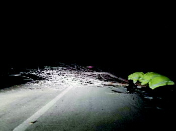 夜色中,民警利用警车灯光,迅速清理倒树。