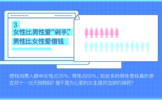 和网购人群女性为主力军的情况不同的是,在借贷人群中,男性占到了绝大多数。根据借贷宝提供的数据,男性借款笔数占比达65%,女性仅为35%。如此多的男性借钱真的是为了在双十一当天购物吗?有不少90后男生表示,借钱可不是为了自己购物,真实目的是为了满足老婆或女友买买买的愿望。