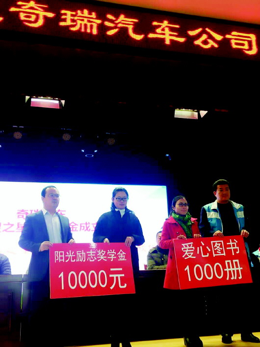 奇瑞汽车捐赠1万元奖学金和1000册图书。