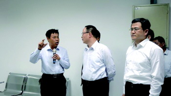 校长岳喜军(左一)正在为时任山东省委常委、常务副省长孙伟(中)和市委书记孙爱军(右一)介绍学校概况。