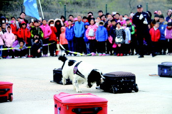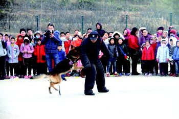 来到警犬训练基地,威海刑侦治安中队的叔叔们为小记者讲解了关于参观警犬的注意事项,并为小记者讲述了犬种和用途等。随后民警带领小记者参观犬舍,并详细介绍每种警犬的特长和经历。“拉布拉多和史宾格的性格大多数都很温顺,嗅觉能力很强,一般用作搜爆犬;德牧的综合能力强,很多工种都能胜任;马里努阿犬则是高大、威猛、爆发力强,护卫犬就成了它的最佳选择”,谈及警犬这个话题,当天带领参观的公安叔叔们总是如数家珍,这份专业和热爱也感染到了参观者。参观过程中,拉布拉多犬成了大家眼中的明星,很多小记者争先恐后的触摸它,想和它做朋友。随后,警犬表演开始了,在警官的带领下,小记者们先是欣赏了警犬现场表演的敏捷性和服从性。随后,民警打一个手势,警犬便站立起来,跟着民警的脚步移动。随后,民警一声令,警犬翻过障碍物、跳过铁栏、越过铁圈,引得学生纷纷鼓掌喝彩。