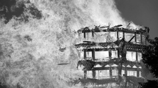 12月10日,四川省绵竹市九龙镇一寺庙突发火灾,寺庙内的大型木塔被烧毁。 新华社发