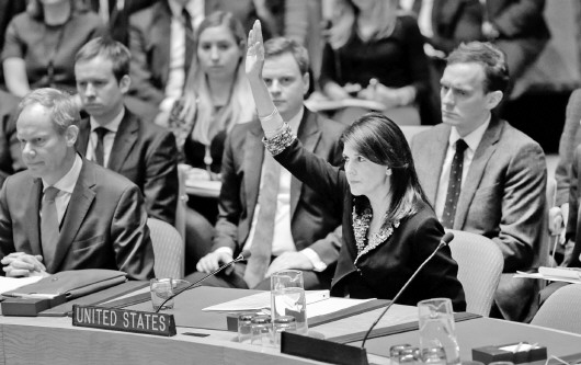◥12月18日,在纽约联合国总部,美国常驻联合国代表黑莉在投反对票时举手。 新华/法新