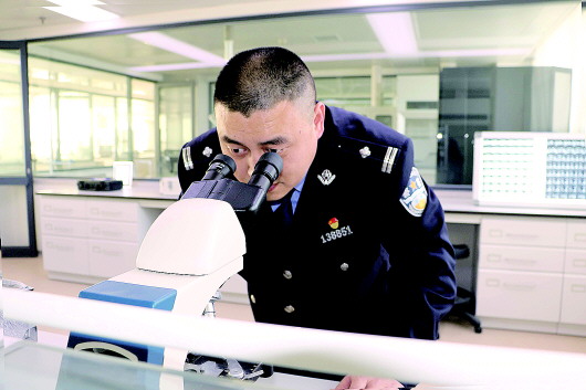 刘鹏借助显微镜对采集的样本进行观察,法医工作容不得丝毫马虎。