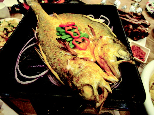 下面这道香葱烤鱼,味道堪称一绝,纯天然的食材,鱼本身选用的就是高品质的鲈鱼。更重要的一点,香葱烤鱼在这里是限量版的,一天只卖20条。一大盘金灿灿的鱼,鱼身整体保持完好,一斤八两左右,色泽鲜黄,经过辣椒和香葱的点缀显得越发好吃。夹一片放进嘴里,这鱼肉质细嫩,鱼片嫩黄爽滑,吃起来香浓可口,鲜美之气萦绕鼻端,放眼望去也找不出几根刺来,省了挑鱼刺的功夫真是让人吃起来更加舒心。
