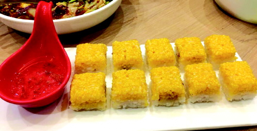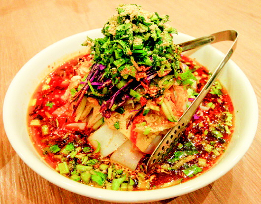 来吃西北菜,怎能不尝尝黄米凉糕?品完香喷喷的肉,来份冰凉软糯的黄米凉糕再好不过。精选自西北的黄米和江米,经过繁琐的加工工艺,成品后的黄米凉糕看起来金黄诱人,被切成豆腐块状的凉糕,下面是白凌凌的江米,中间夹着红枣,最上层则是金灿灿的黄米,非常有层次感。虽说现在是寒冬,可这黄米凉糕一入口,冰凉沁心、香甜软糯,就着醉人的桂花蜜,满嘴的甜味,舌苔凉凉的,感觉说不上来的好,我们很快吃了个精光。