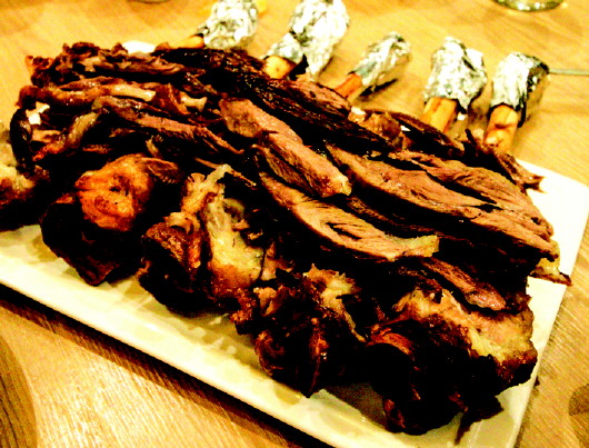 没一会,香喷喷的烧羊棒上桌了,不愧是招牌菜,光看整体的卖相就让人食欲大振。摆盘并不花哨,只见烧羊棒整齐的摆放在盘中,旁边配有蘸料,根根个大肉厚,色泽红亮,浓香袭人,无不体现着西北菜的夯实与豪气。拿一根趁热开吃,皮脆肉香,肉质外焦里嫩,吃进嘴里不膻不腥,肉在齿间撕扯的快感,让我们吃的大快朵颐,一根不够那就再来一根。