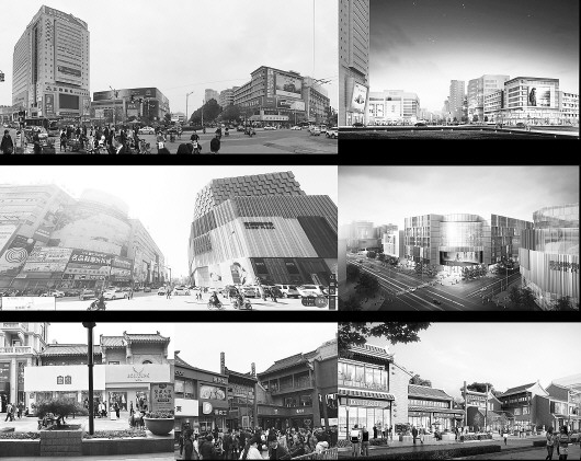 图片自上而下分别是泉城路西口、泉城路天地坛街路口、芙蓉街牌匾现状和规划效果图。 济南市规划局供稿