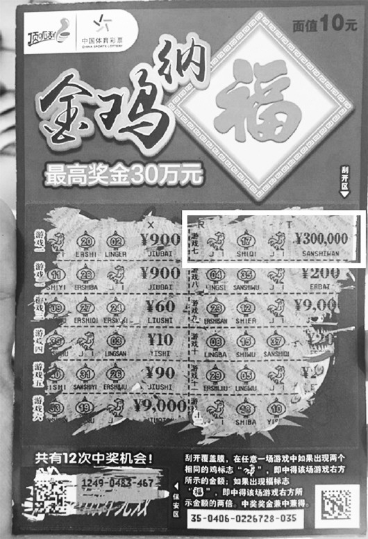 顶呱刮“金鸡纳福”是一款贺岁票,以寓意吉祥如意的锦鸡为主题,绚丽的色彩中透露出浓浓的中国风。单张面值10元,有12次中奖机会,最高奖金30万元,如果在任意一场游戏中如果出现两个相同的“鸡”标志,即中得该场游戏右方所示的金额。这位泰安小伙就是在“游戏七”中刮出了两个鸡标志,中得后方所示金额为¥300000。