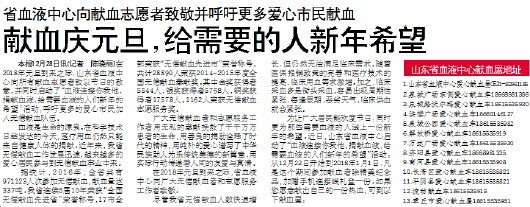 本报12月28日讯(记者 陈晓丽)在2018年元旦到来之际,山东省血液中心向所有献血志愿者致以节日的敬意,并同时启动了“血液连接你我他,捐献血液,给需要血液的人们新年的希望”活动,呼吁更多的爱心市民加入无偿献血队伍。